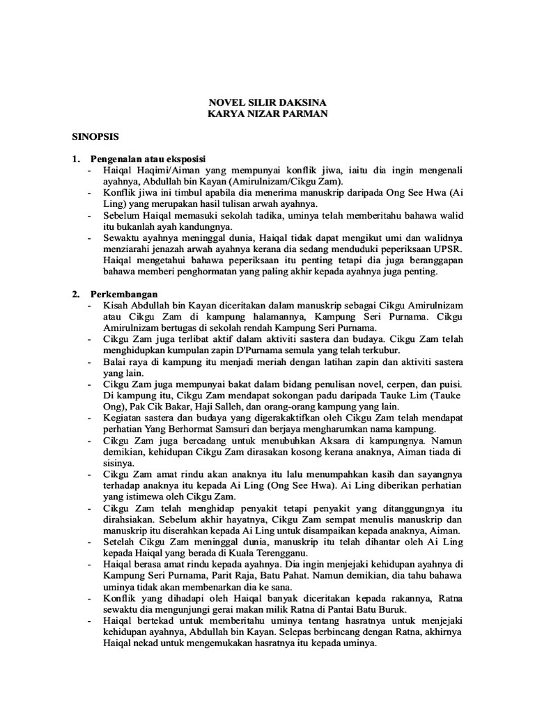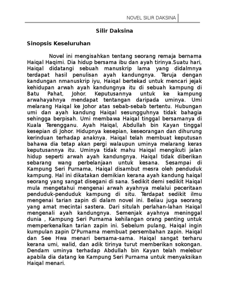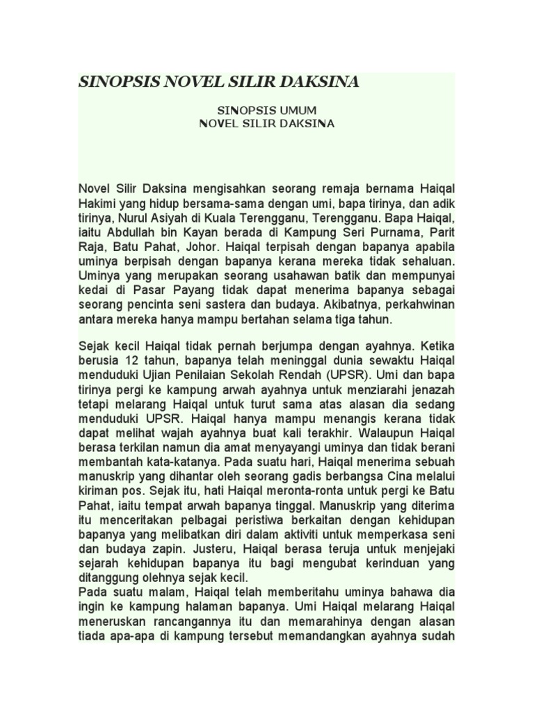 Sinopsis Novel Silir Daksina. Sinopsis Tema Persoalan Nilai yang dikongsikan di bawah. Haiqal tidak mampu untuk membahagiakan semua orang tetapi.