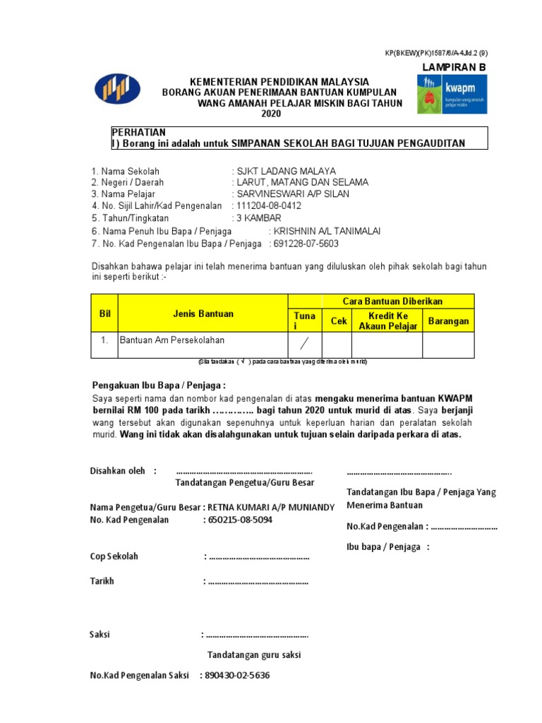 Negeri Daerah. 2 9 LAMPIRAN B KEMENTERIAN PENDIDIKAN MALAYSIA BORANG AKUAN PENERIMAAN BANTUAN KUMPULAN WANG AMANAH PELAJAR MISKIN BAGI TAHUN PERHATIAN I Borang ini adalah untuk SIMPANAN SEKOLAH BAGI TUJUAN PENGAUDITAN.
